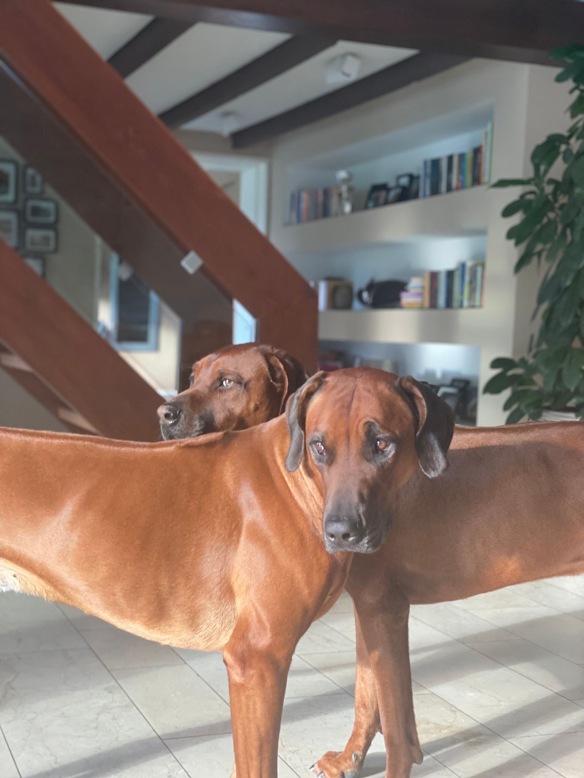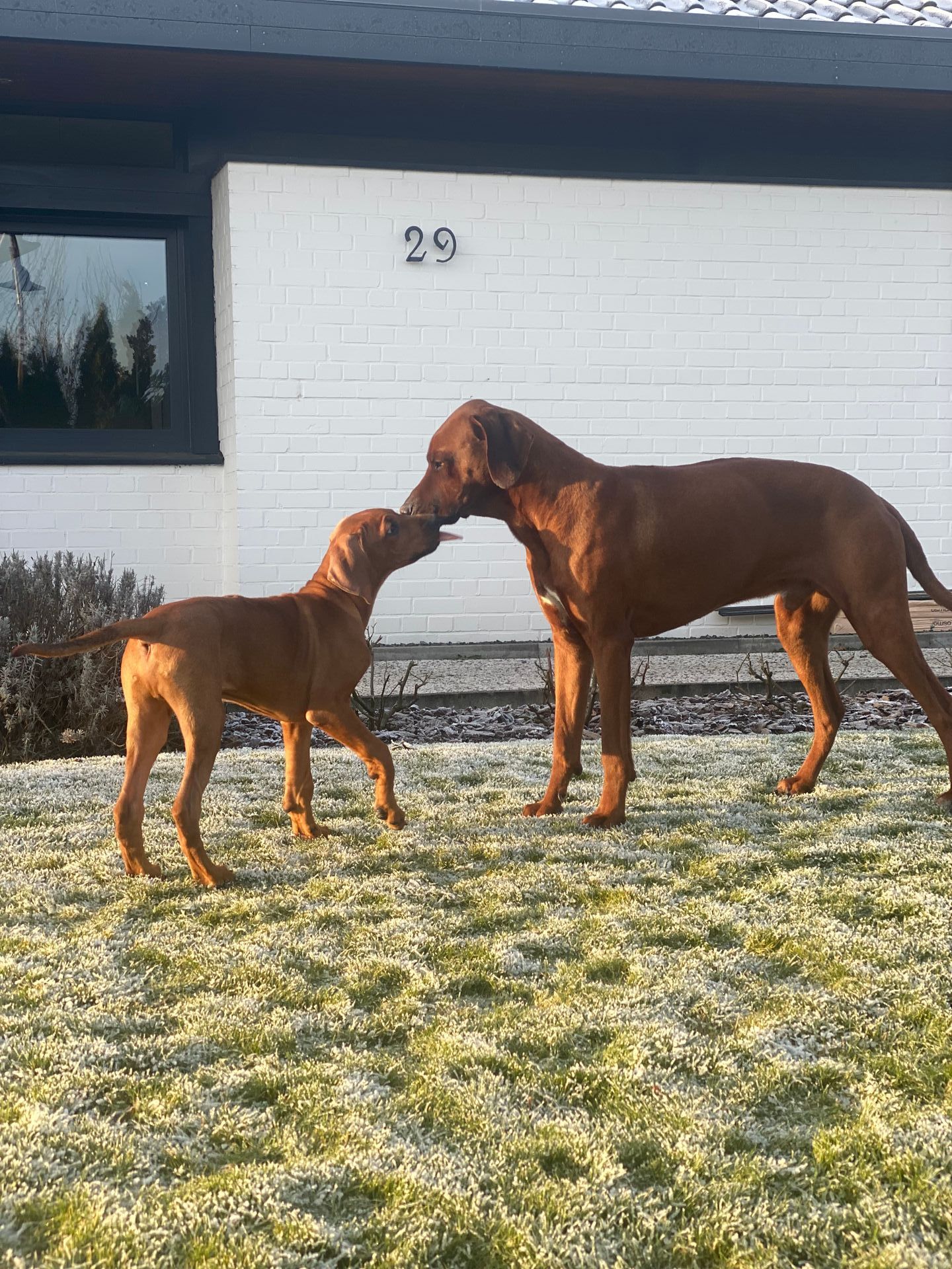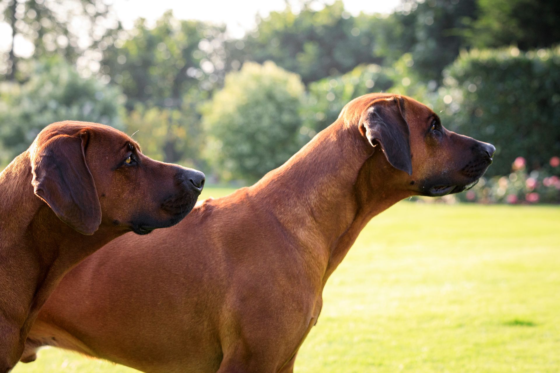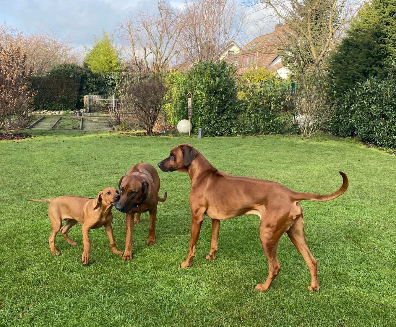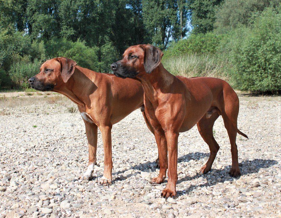Unsere Ridgebacks treffen auf ihren täglichen Spaziergängen Hunde verschiedenster Rassen und bleiben dabei immer souverän und zeigen sich eher - Ridgeback-typisch - wenig interessiert.