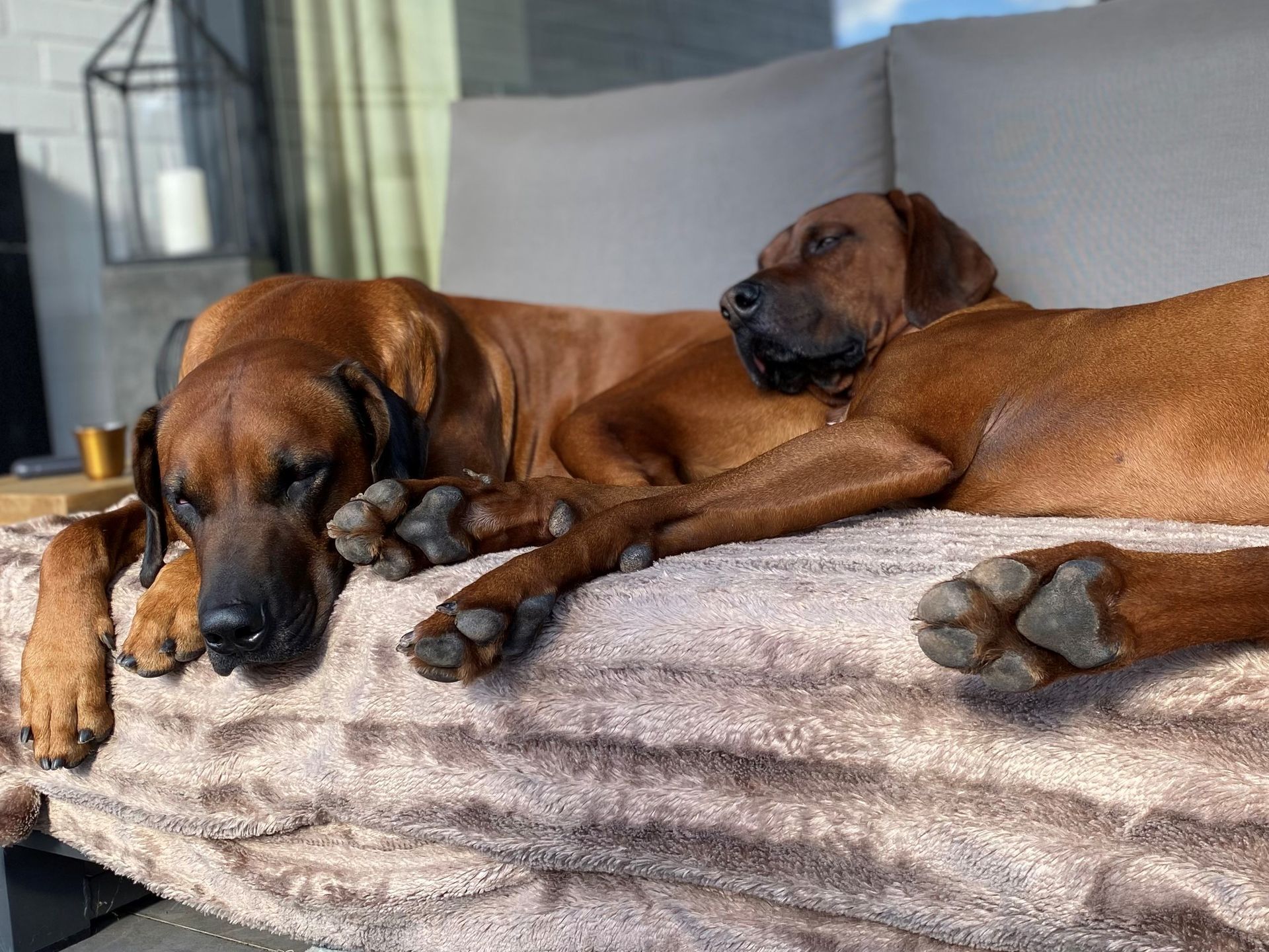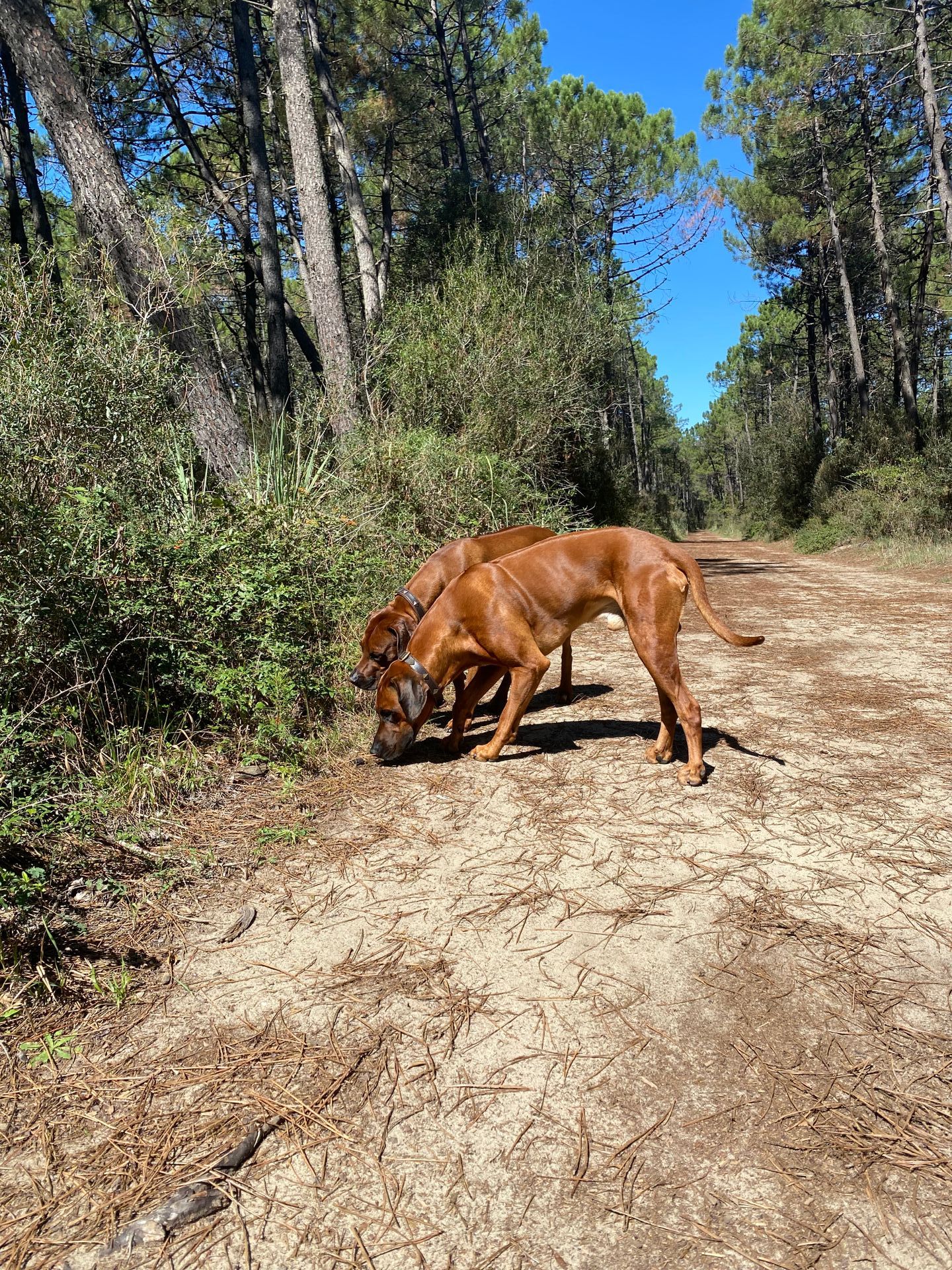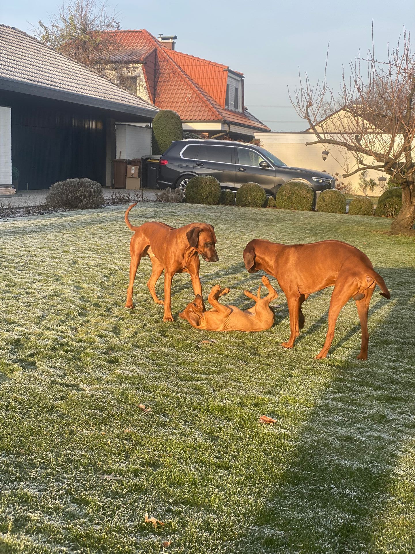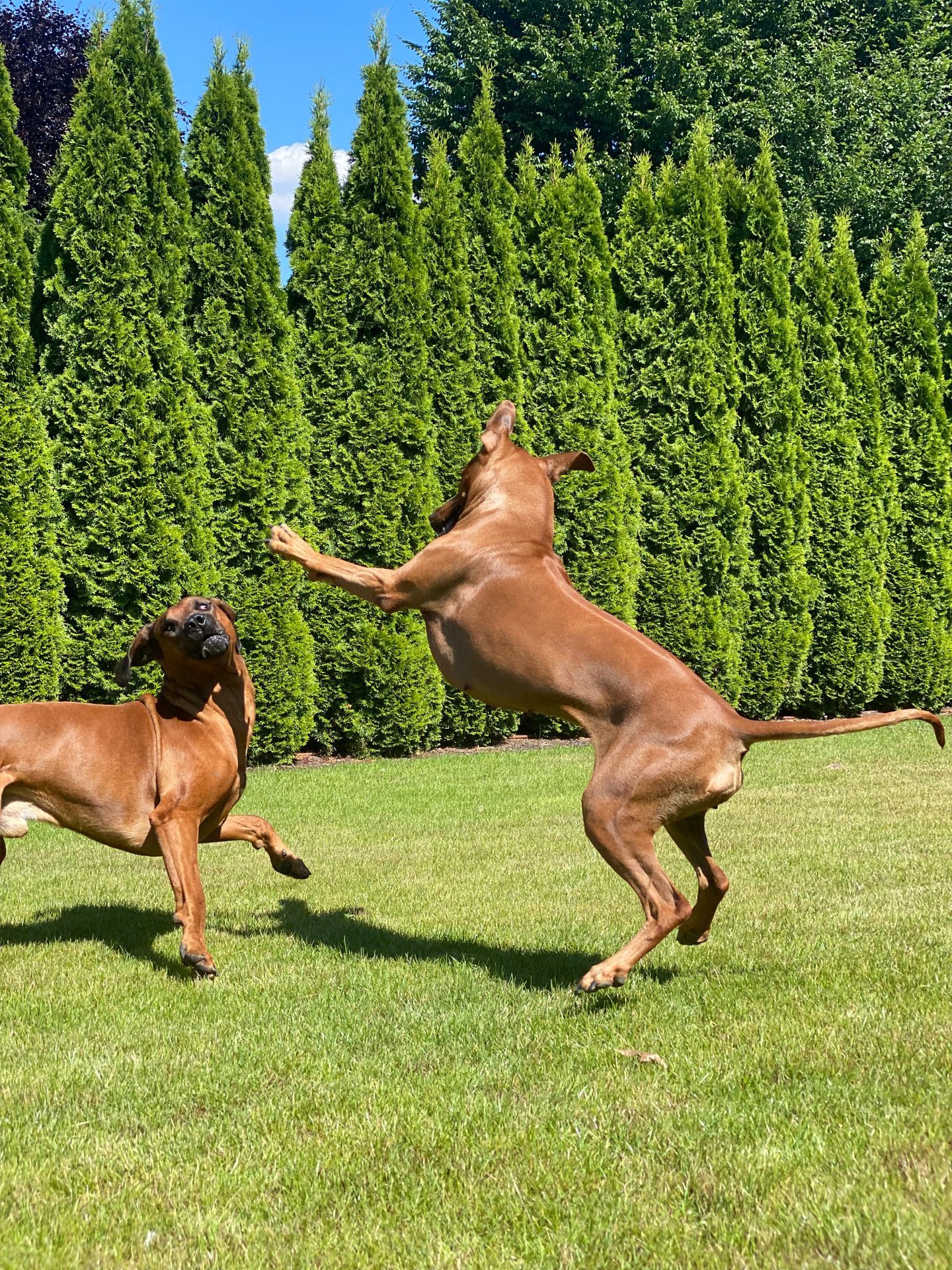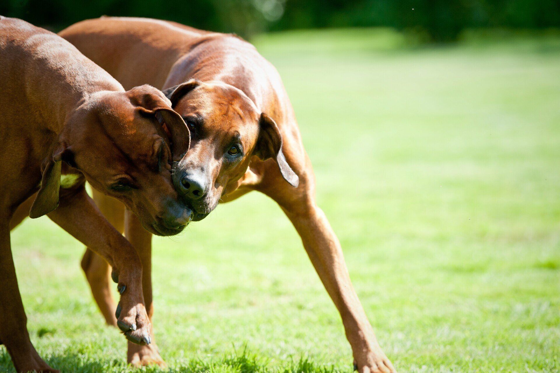 Unsere Ridgebacks treffen auf ihren täglichen Spaziergängen Hunde verschiedenster Rassen und bleiben dabei immer souverän und zeigen sich eher - Ridgeback-typisch - wenig interessiert.